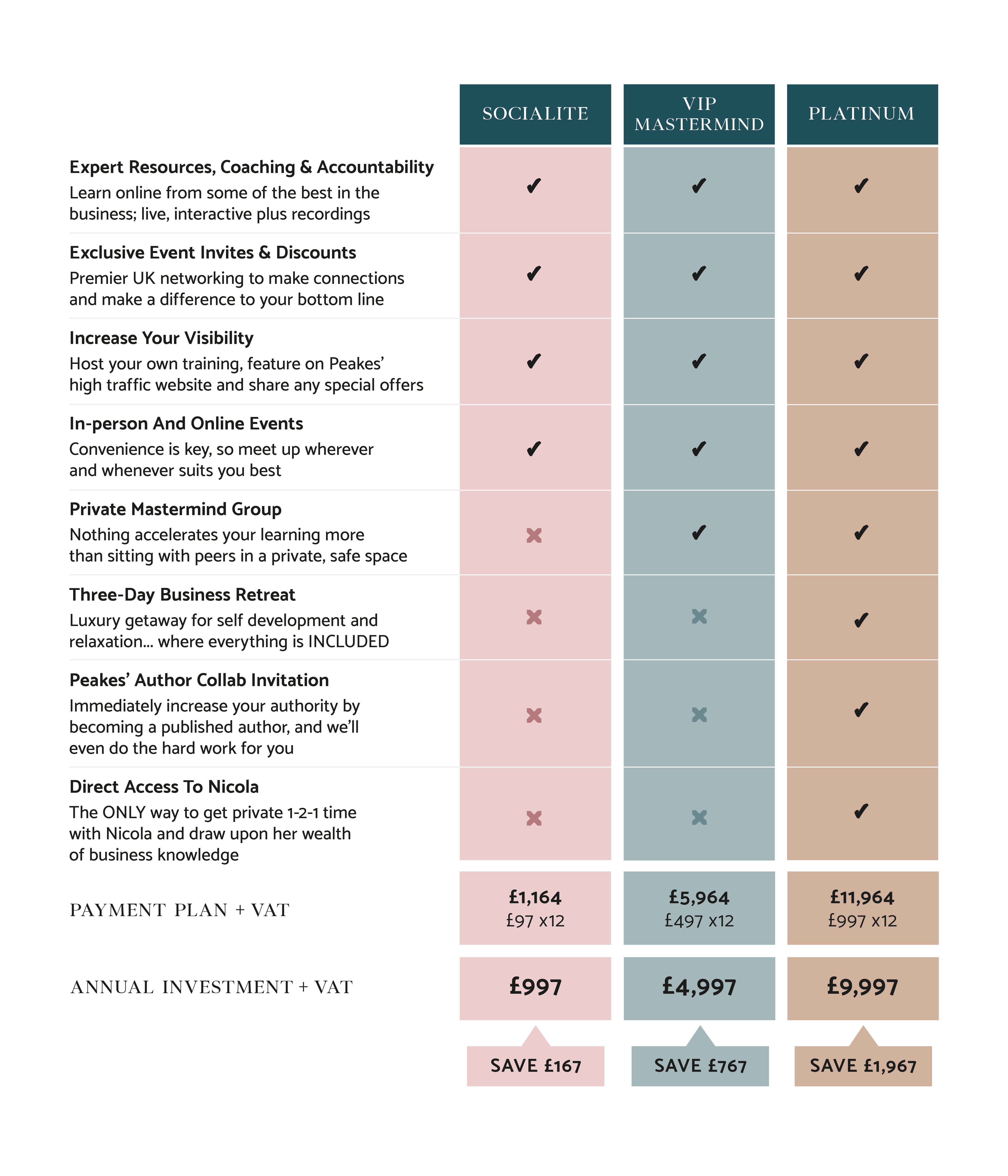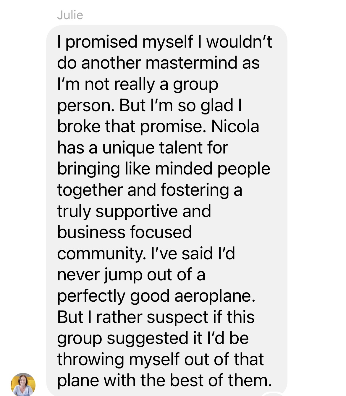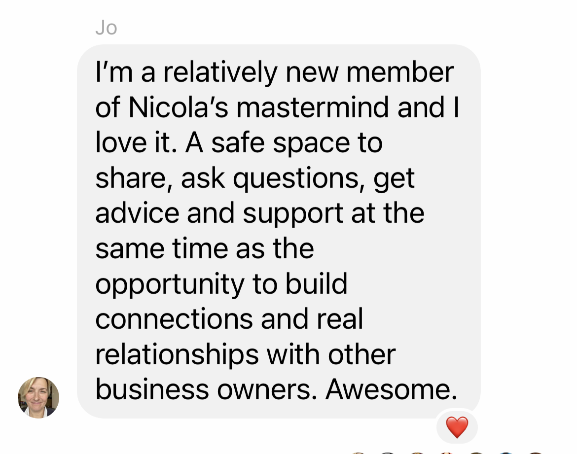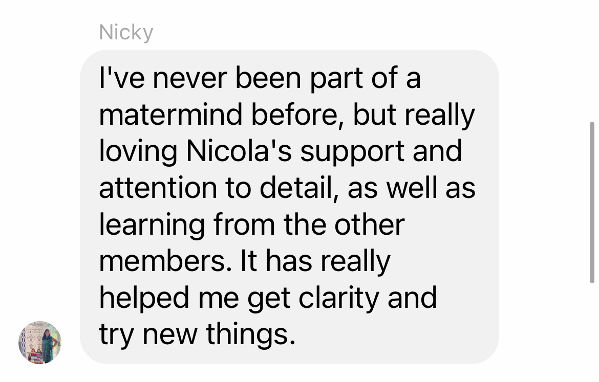 Perhaps you've joined a mastermind before and not reaped the rewards. Chances are, it was them and not you. They have allowed the wrong people into the group, or they have just filled the space with trainings and zooms. Which is why Nicola herself does the qualifying for Platinum.